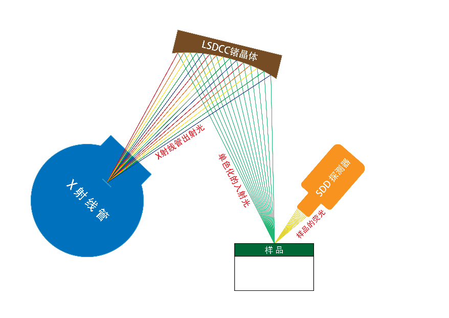 激發X射線先照射到晶體或單質材料上,得到的單色化的X射線再照到樣品上,樣品激發出X射線熒光直接探測器并依據其能量對其進行分析。 |