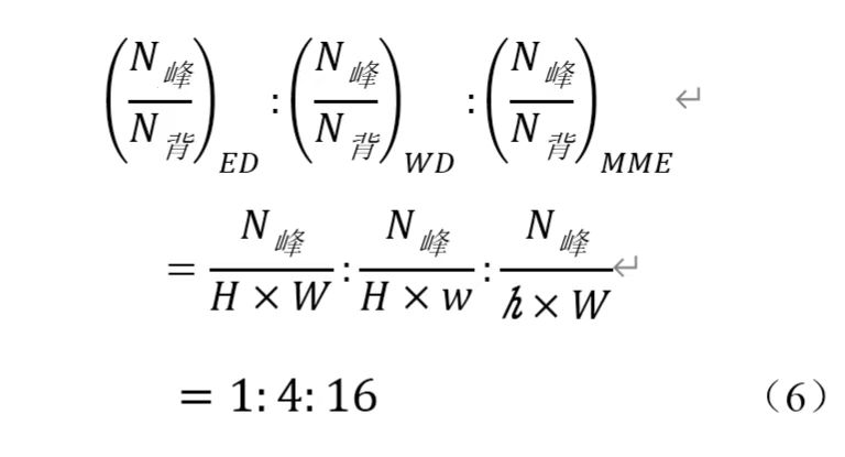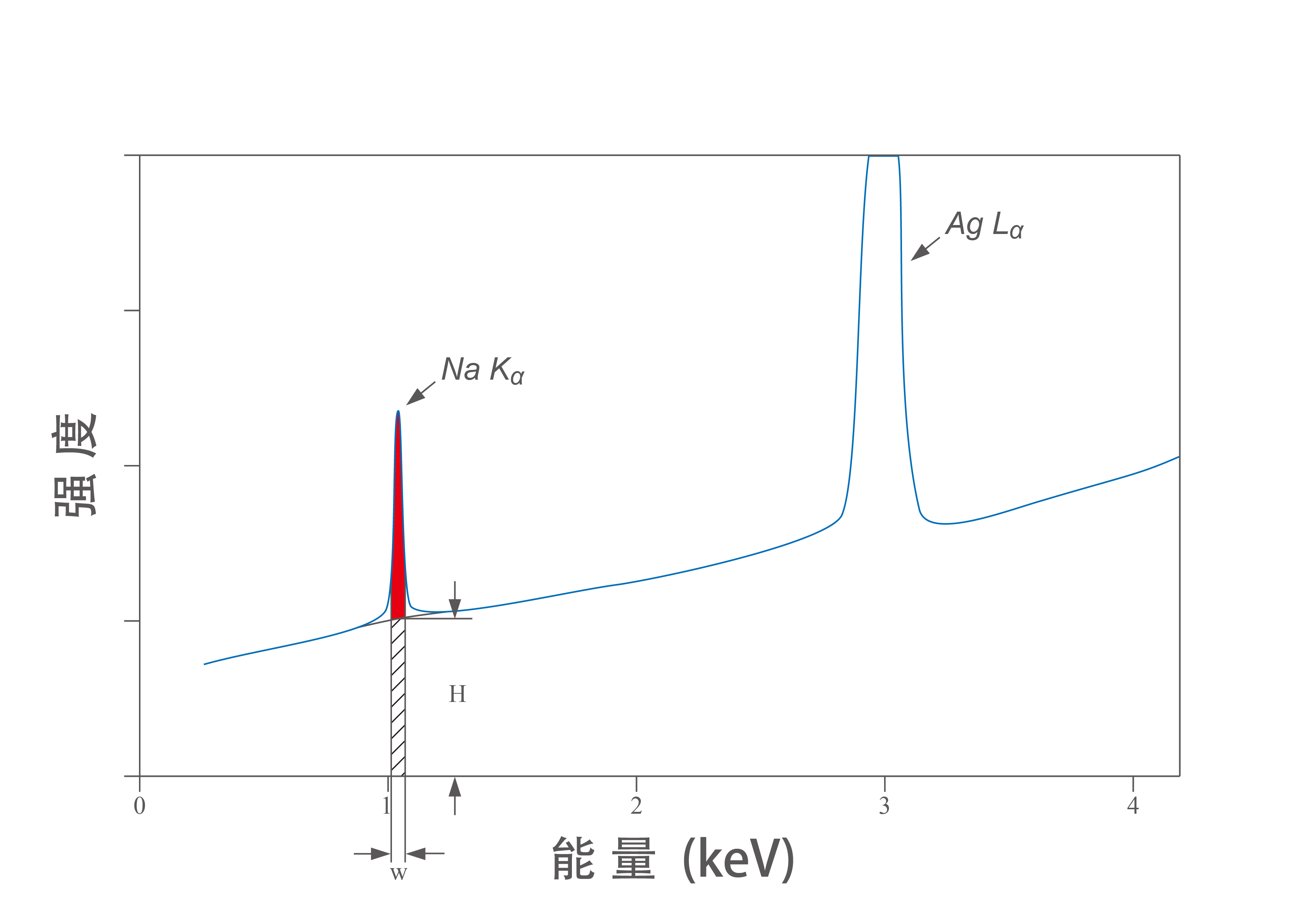 圖2、6中的W就是(1)和(3)式中的W,是感興趣區的寬度,這二種光譜儀都是能量色散的,所以寬度是一樣的,一般取能量分辨率的1.2倍~1.8倍。能量分辨率(Energy resolution)是指,針對兩種不同能量的入射粒子,光譜儀所能夠測定最小的能量間隔。能量分辨率定義為FWHM(全能峰高度一半處的峰寬度)與峰位能量的比值,或直接用FWHM表示。能量色散光譜儀的分辨率就是所用SSD探測器的分辨率,一般在130eV左右。
