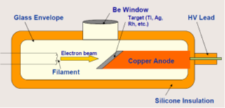 X射線管(X-ray tube)產生X射線的方法是加熱陰極(例如燈絲),使電子從熱陰極材料發出,并通過施加的高壓向陽極加速,用加速后的電子撞擊陽極材料(金屬靶),撞擊過程中,電子突然減速,其損失的動能(其中的1-2%)會以光子形式放出,形成X射線光譜的連續部分,稱之為韌制輻射。通過加大加速電壓,電子攜帶的能量增大,則有可能將金屬靶原子的內層電子撞出。于是內層形成空穴,外層電子躍遷回內層填補空穴,同時放出波長在0.1納米左右的光子。由于外層電子躍遷放出的能量是量子化的,所以放出的光子的波長也集中在某些部分,形成了X射線光譜中的特征線,此稱為特征輻射。
