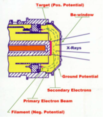 X射線管中,為了防止與氣體分子發生碰撞,必須將電子束的區域抽真空。因此在外殼內有一個真空。X射線在特定點從外殼中逸出,這特定點就是特別透明的薄鈹窗。